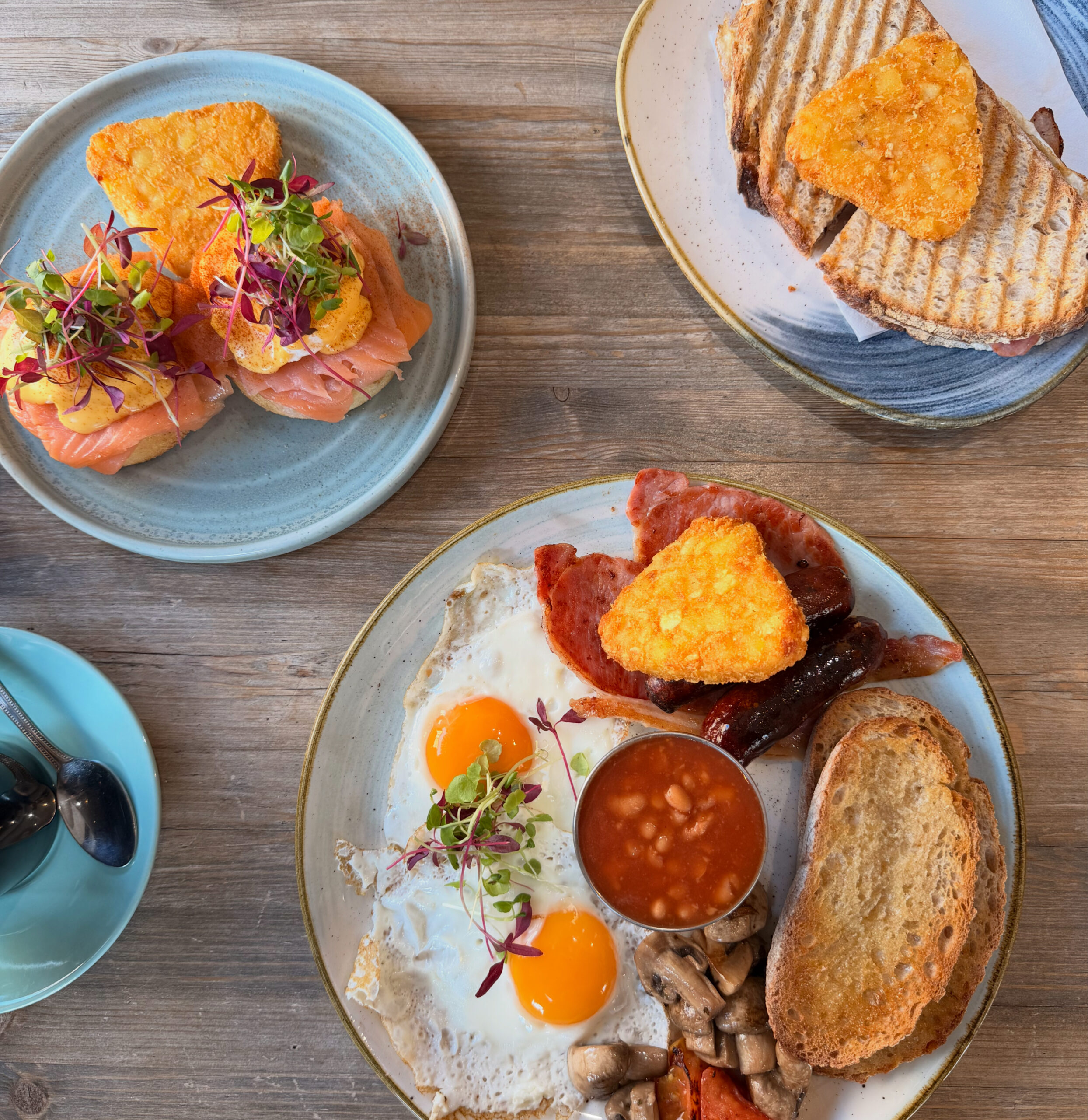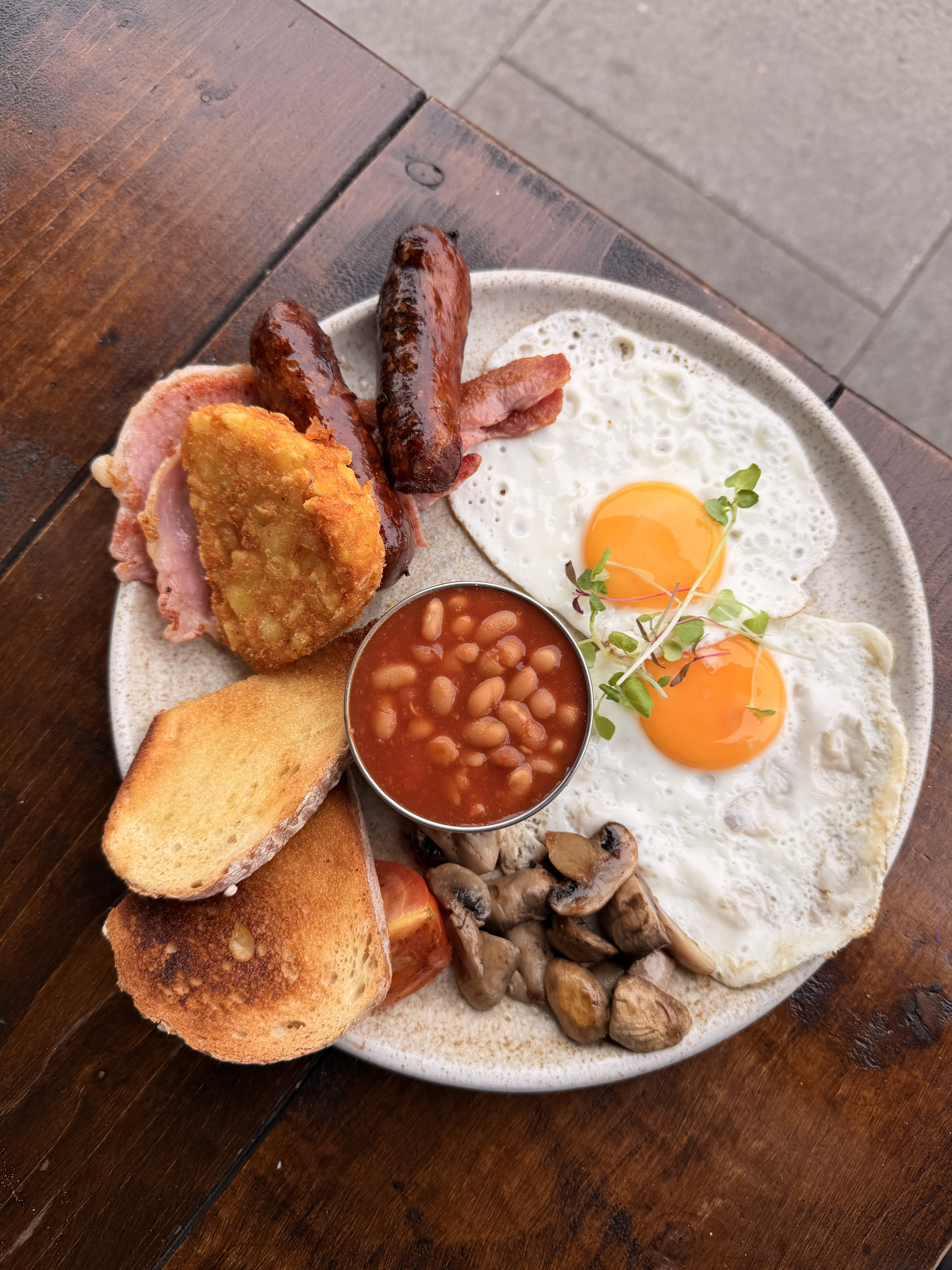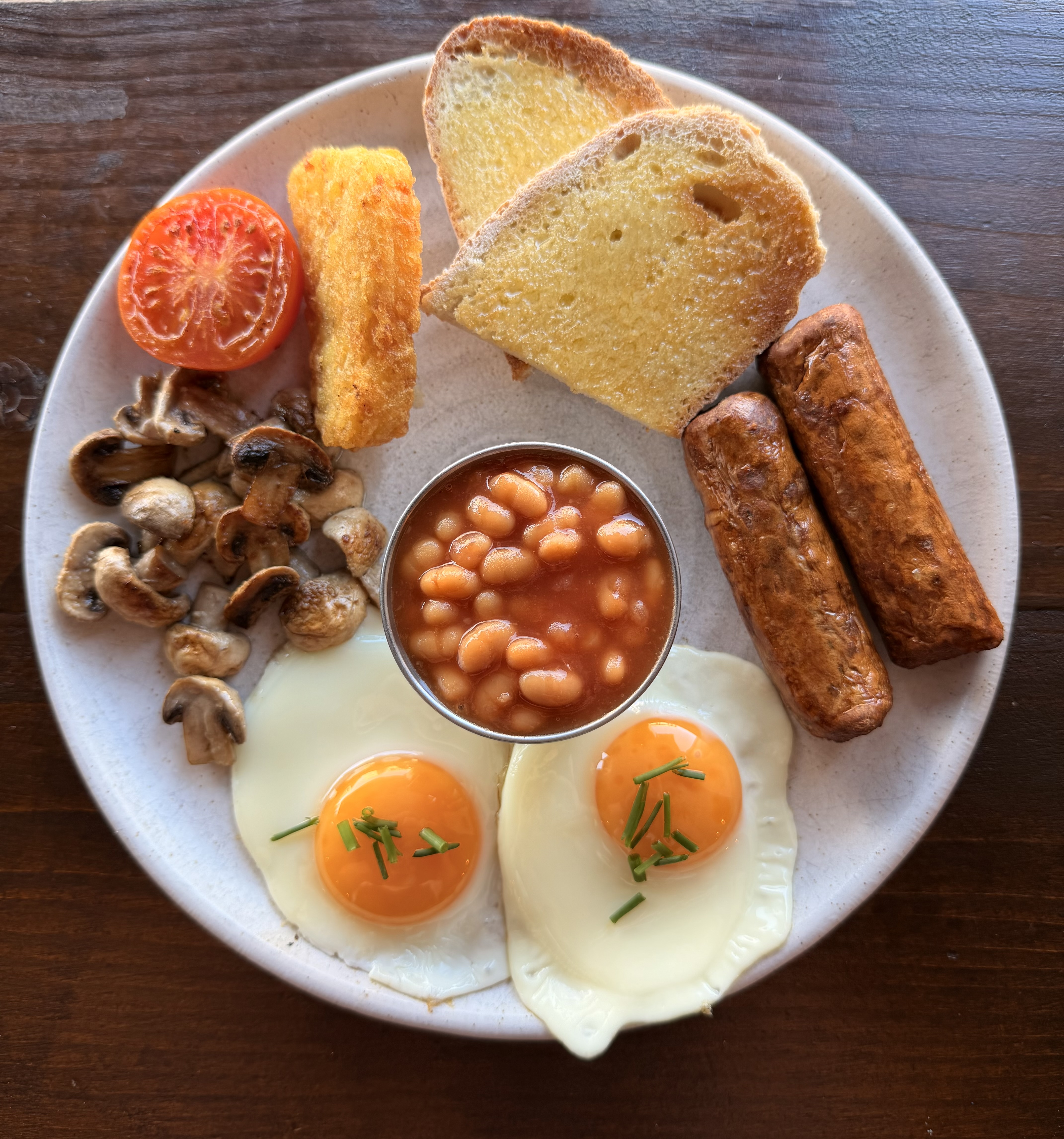 Two free range fried eggs, two Cumberland sausages, two slices of bacon, mushrooms, grilled tomato, baked beans,